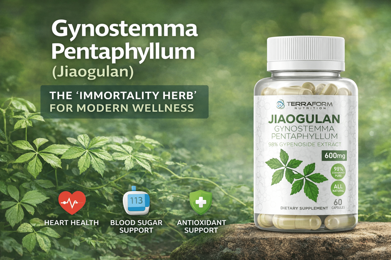 - 600 mg Gynostemma pentaphyllum per capsule