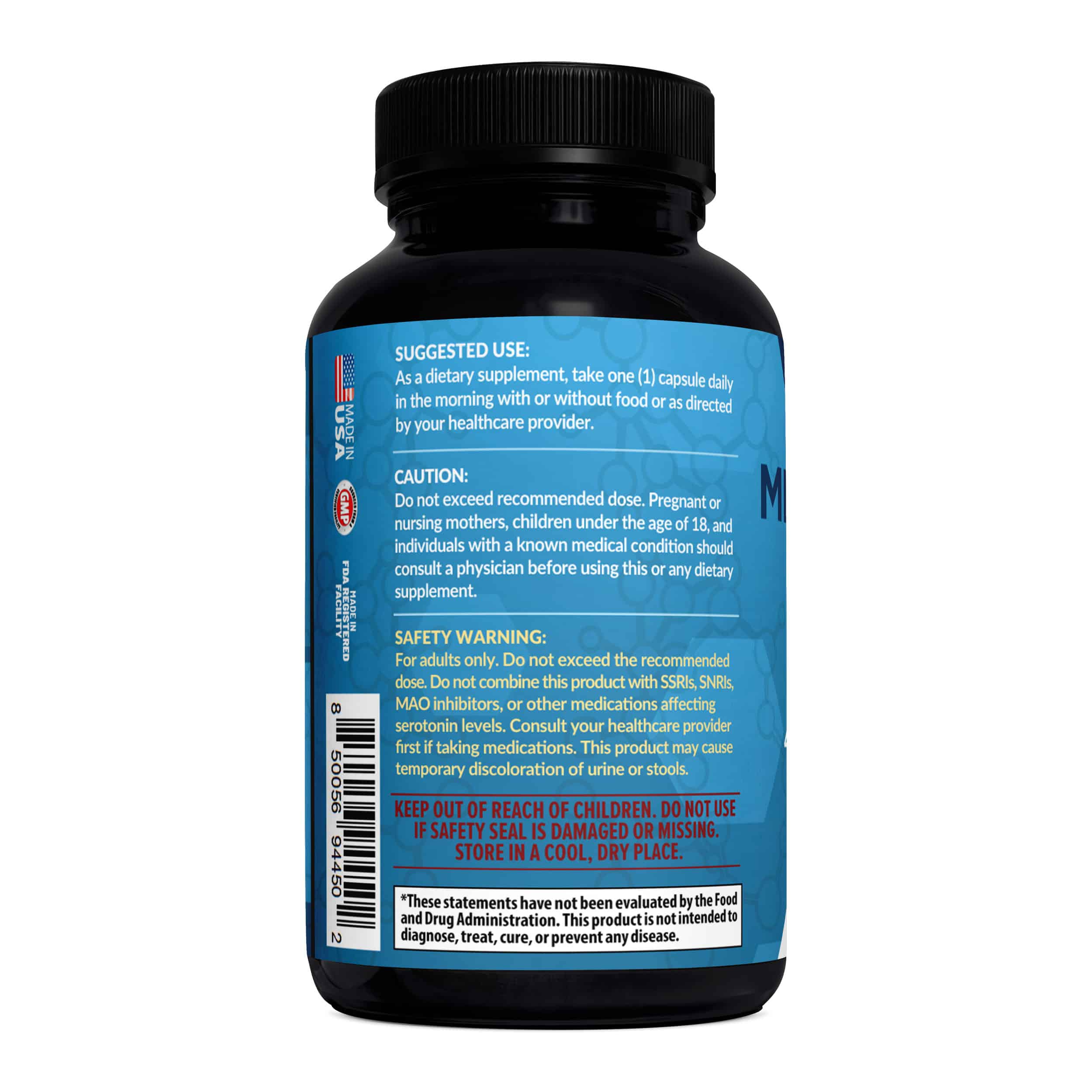 Safety Warning: For adults only. Do not exceed the recommended dose. Do not combine this product with SSRIs, SNRIs, MAO inhibitors, or other medications affecting serotonin levels. Consult your healthcare provider first if taking medications. This product may cause temporary discoloration of urine or stools.