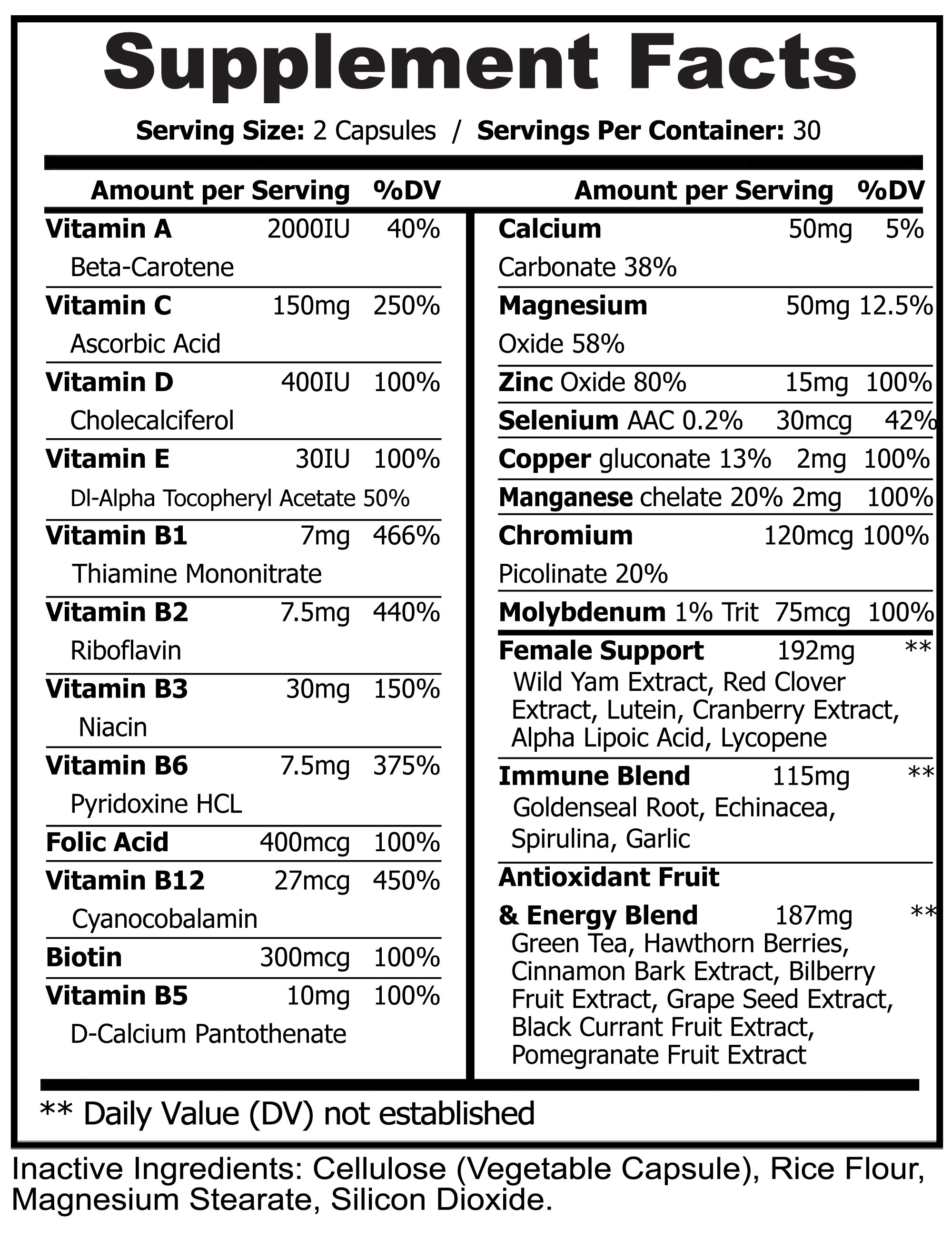Vitamin A (Beta-Carotene), Vitamin C (Ascorbic Acid), Vitamin D (Cholecalciferol), Vitamin E (DL-Alpha Tocopheryl Acetate 50%), Vitamin B1 (Thiamine Mononitrate), Vitamin B2 (Riboflavin), Vitamin B3 (Niacin), Vitamin B6 (Pyridoxine HCL), Folic Acid, Vitamin B12 (Cyanocobalamin), Biotin, Vitamin B5 (D-Calcium Pantothenate), Calcium (Carbonate 38%), Magnesium (Oxide 58%), Zinc (Oxide 80%), Selenium (AAC 0.2%), Copper (Gluconate 13%), Manganese (Chelate 20%), Chromium (Picolinate 20%), Molybdenum (1% Trit), Wild Yam Extract, Red Clover Extract, Lutein, Cranberry Extract, Alpha Lipoic Acid, Lycopene, Golden Seal Root, Echinacea, Spirulina, Garlic, Green Tea, Hawthorn Berries, Cinnamon Bark Extract, Bilberry Fruit Extract, Grape Seed Extract, Black Currant Fruit Extract, Pomegranate Fruit Extract